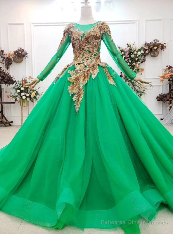 Custom Made Green Ball Gown Tulle Sequins Appliques Long Sleeve Wedding Dress