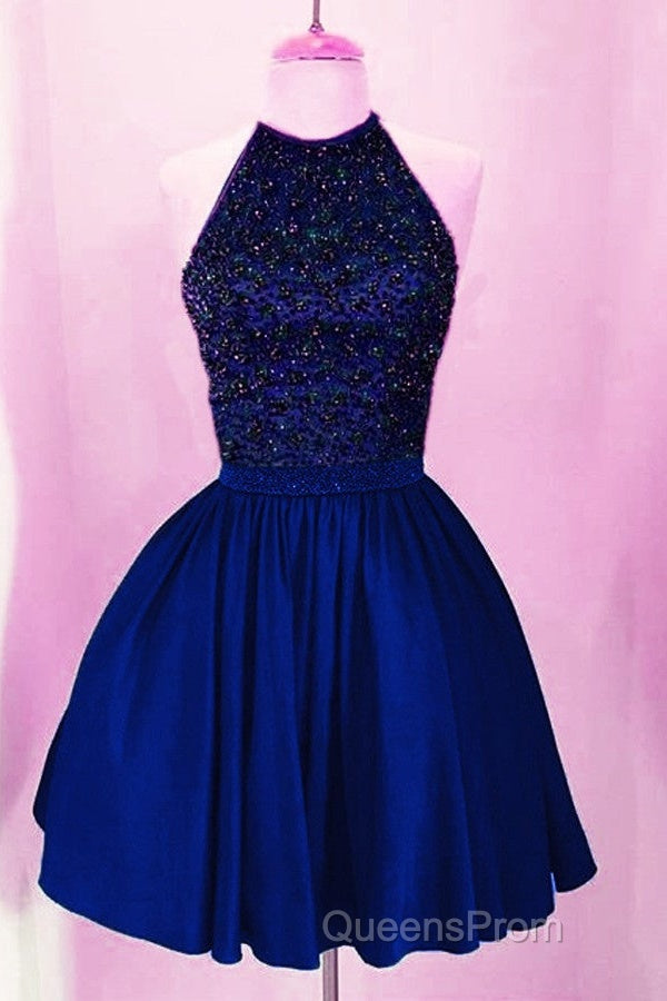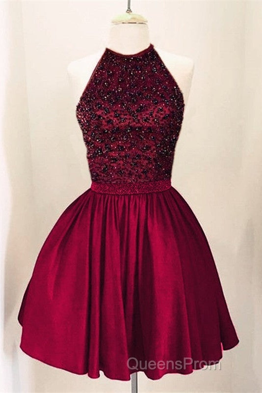 A-Line Beaded Halter Keyhole Back Satin Homecoming Dress Short