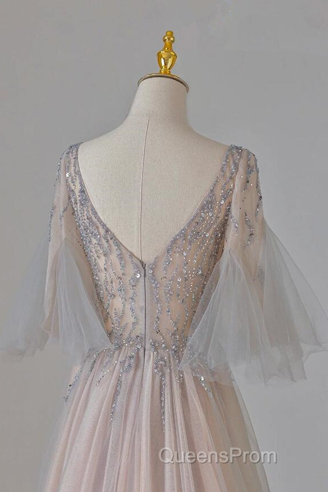 A-Line Beaded V-Neckline Tulle Formal Dress, Puffy Sleeves Long Evening Prom Dress