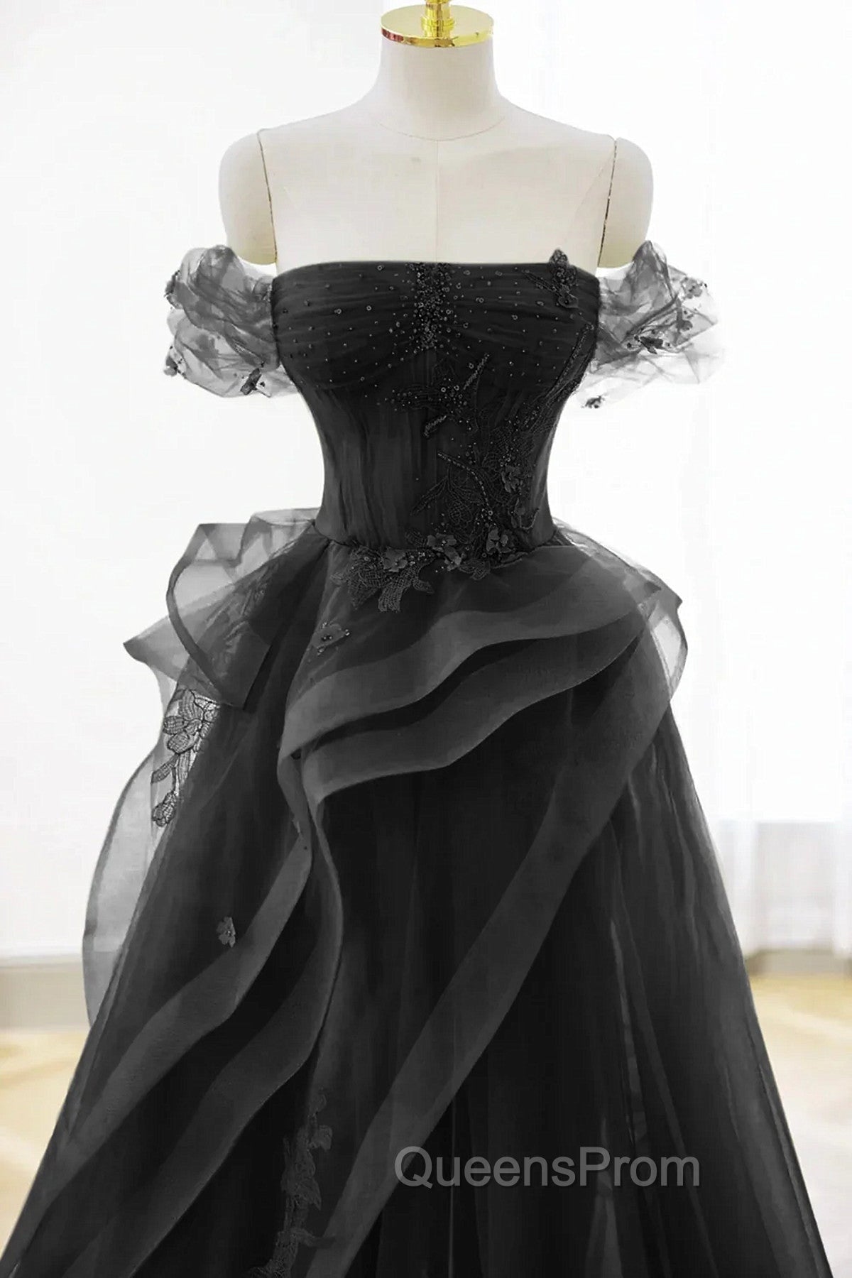 A-Line Black Off Shoulder Tulle With Lace Party Dress, Black Tulle Evening Prom Dress
