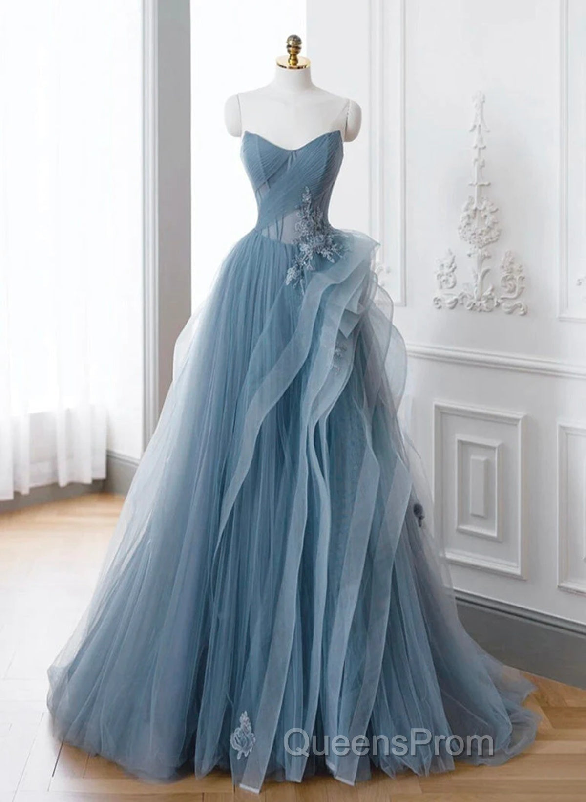 A-Line Blue Tulle Long Party Dress With Lace, Off Shoulder Tulle Evening Prom Dress