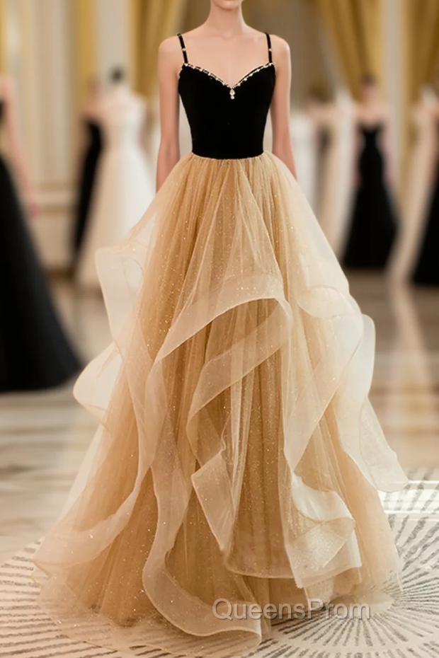 A-Line Champagne Tulle Sweetheart Beaded Long Evening Prom Dress, Tulle Layers Party Dress