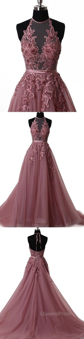 A Line Halter Neck Lace Evening Prom Dress With Sweep Train, Backless Formal Dress, Evening Dress
