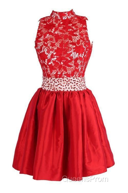 A-Line High Neck Knee Length Satin Homecoming Dress With Lace