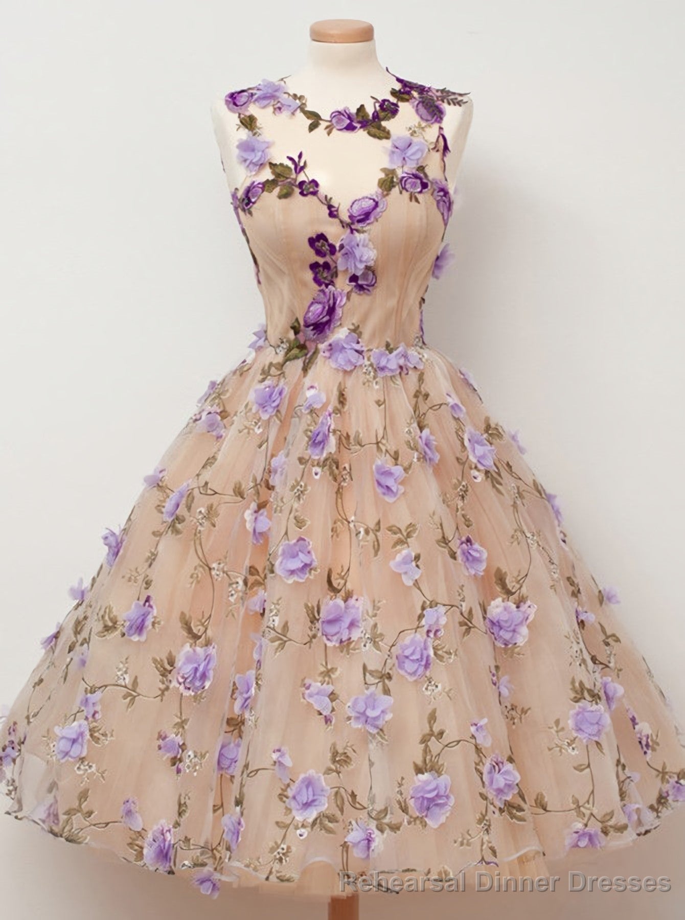 A Line Jewel Tea Length Open Back Champagne Tulle With Appliques Flowers Short Homecoming Dresses