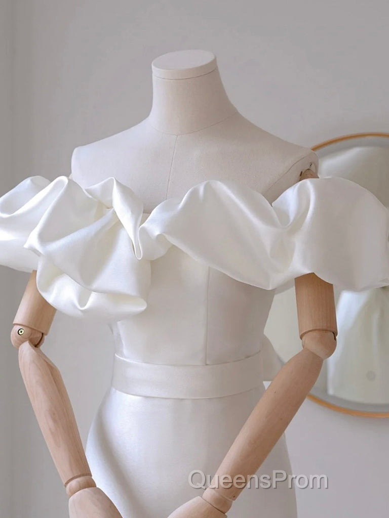 A-Line Off Shoulder Satin White Long Evening Prom Dress, White Long Party Dress