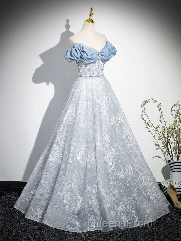 A-Line Off Shoulder Tulle Lace Beads Blue Long Evening Prom Dress, Blue Long Formal Dress