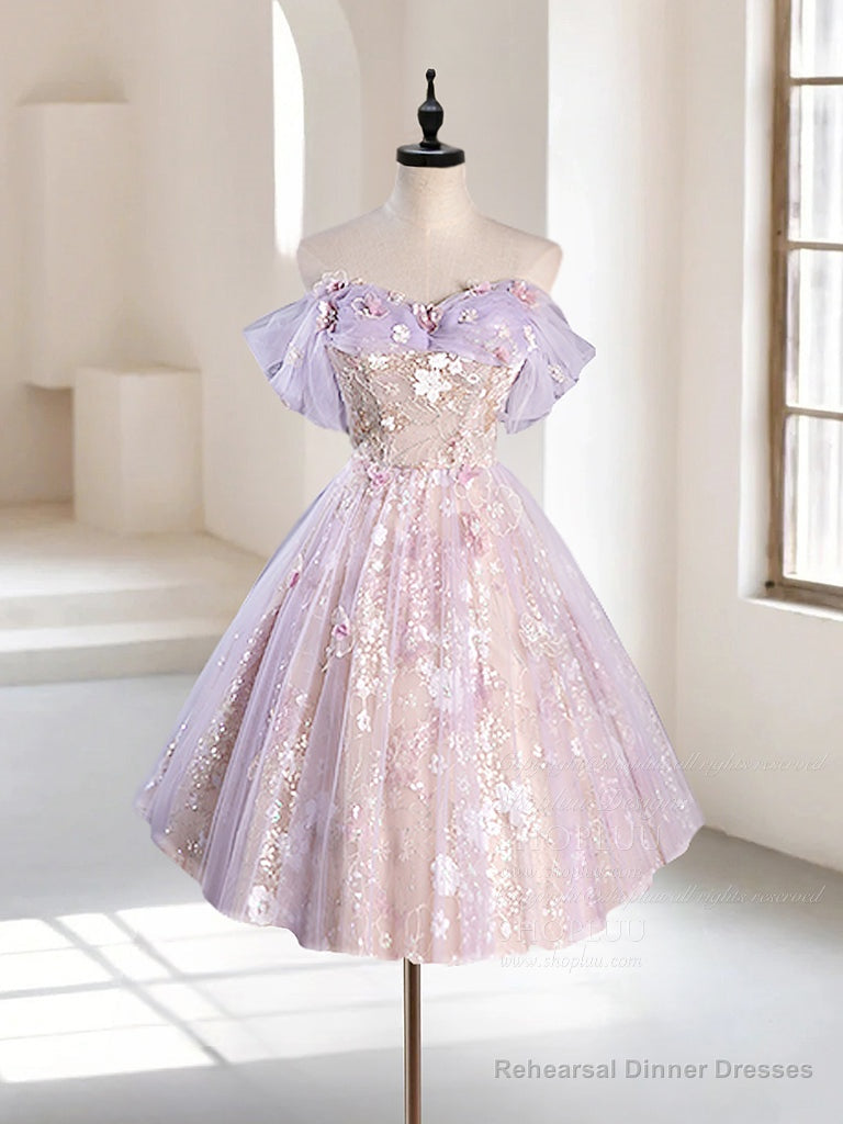 A-Line Off Shoulder Tulle Lace Purple Short Prom Dress, Cute Purple Homecoming Dress