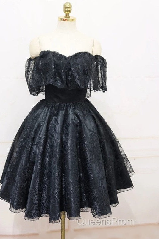 A-Line Off The Shoulder Short Black Lace Homecoming Dress