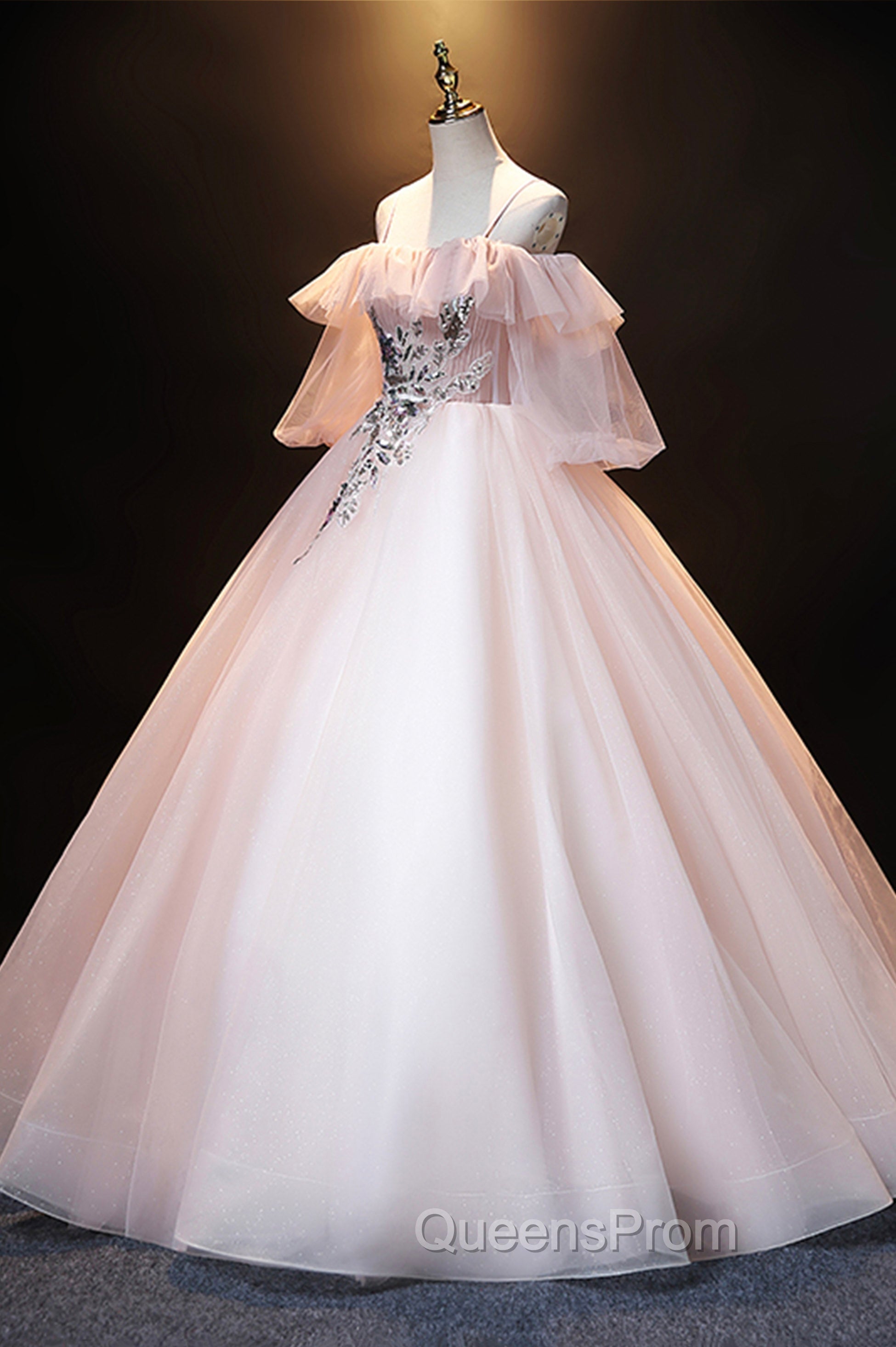 A-Line Pink Spaghetti Straps Long Evening Prom Dress, Pink Lace Evening Dress