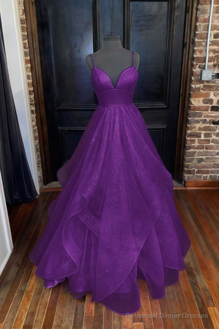 This dazzling prom dress boasts an A-line, princess silhouette and a sweetheart neckline. The sleeveless design features no wrap, with a zipper closure at the back. The tulle fabric is adorned with shimmering glitter embellishments, creating an elegant and glamorous look. The dress is fully lined and includes both a built-in bra and boning for added support. The straps are thin spaghetti straps.