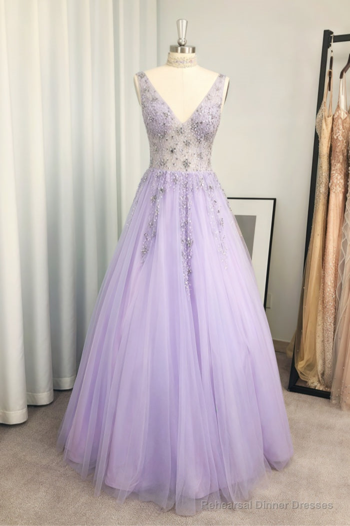 This elegant A-line/Princess prom dress features a V-neckline, beading, and sequins on a gorgeous floor-length tulle skirt. Designed to flatter any figure, it's the perfect choice for any formal occasion. Make a statement and dazzle in this beautiful dress.