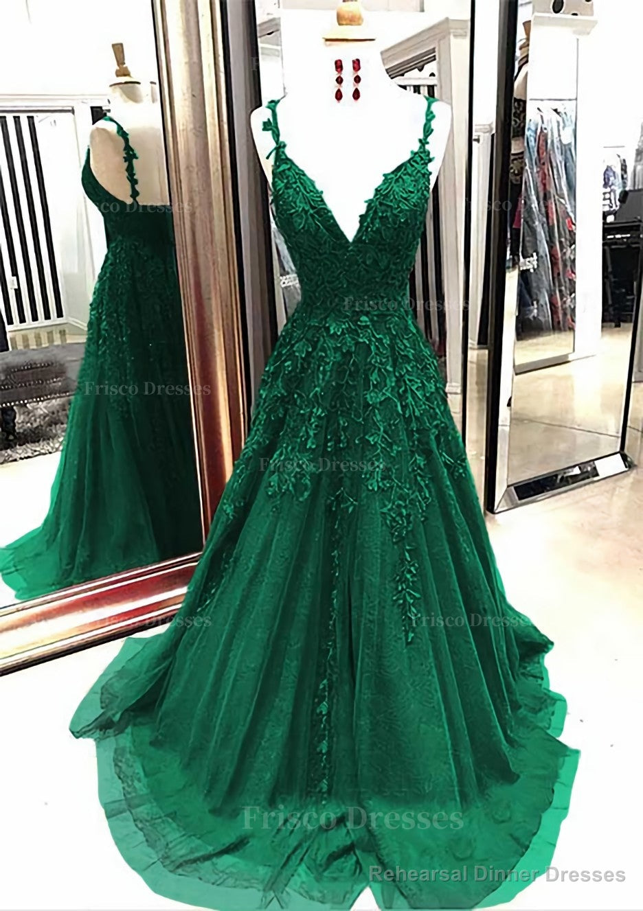 This A-line/Princess prom dress features a V-neck, sleeveless design and a sweeping train for an elegant look. The tulle fabric is adorned with beautiful appliques for added texture. Stand out at your prom with this timeless and sophisticated dress.