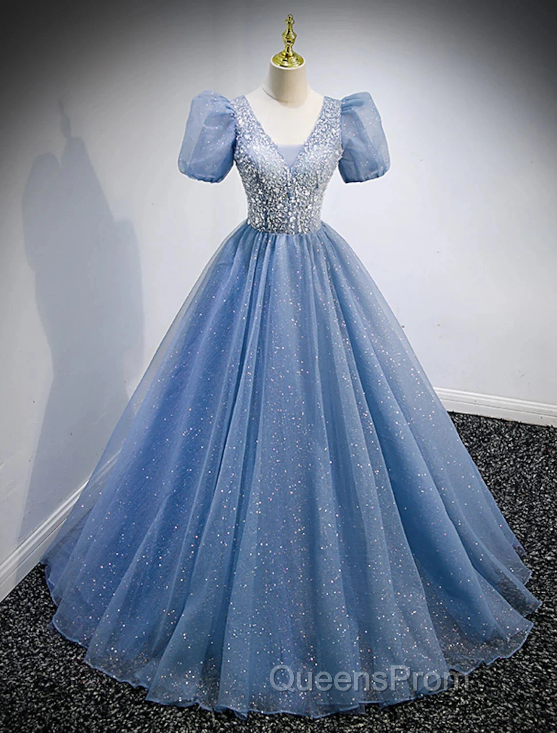 A-Line Evening Prom Dress Puffy Dress Quinceanera Floor Length Short Sleeve V Neck Tulle With Sequin