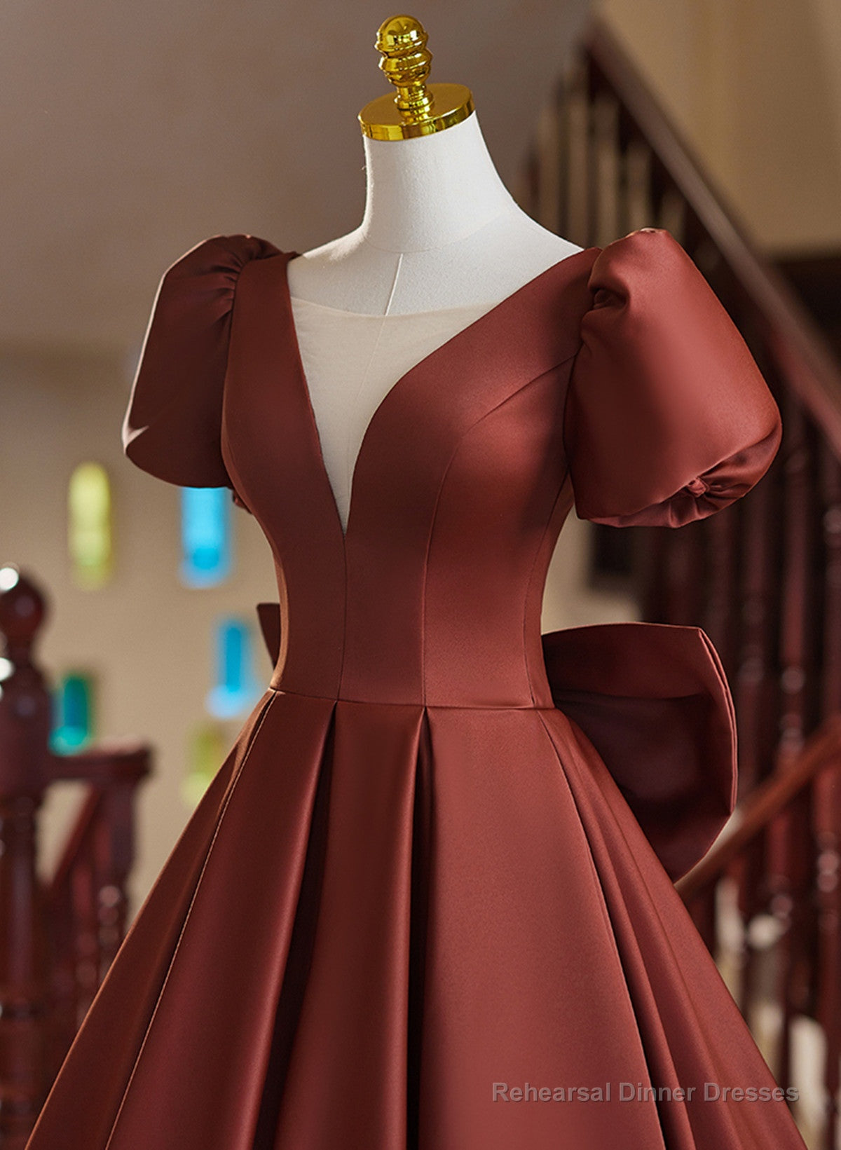 A-line Satin Short Sleeves Long Prom Dress, Satin Simple Evening Dress