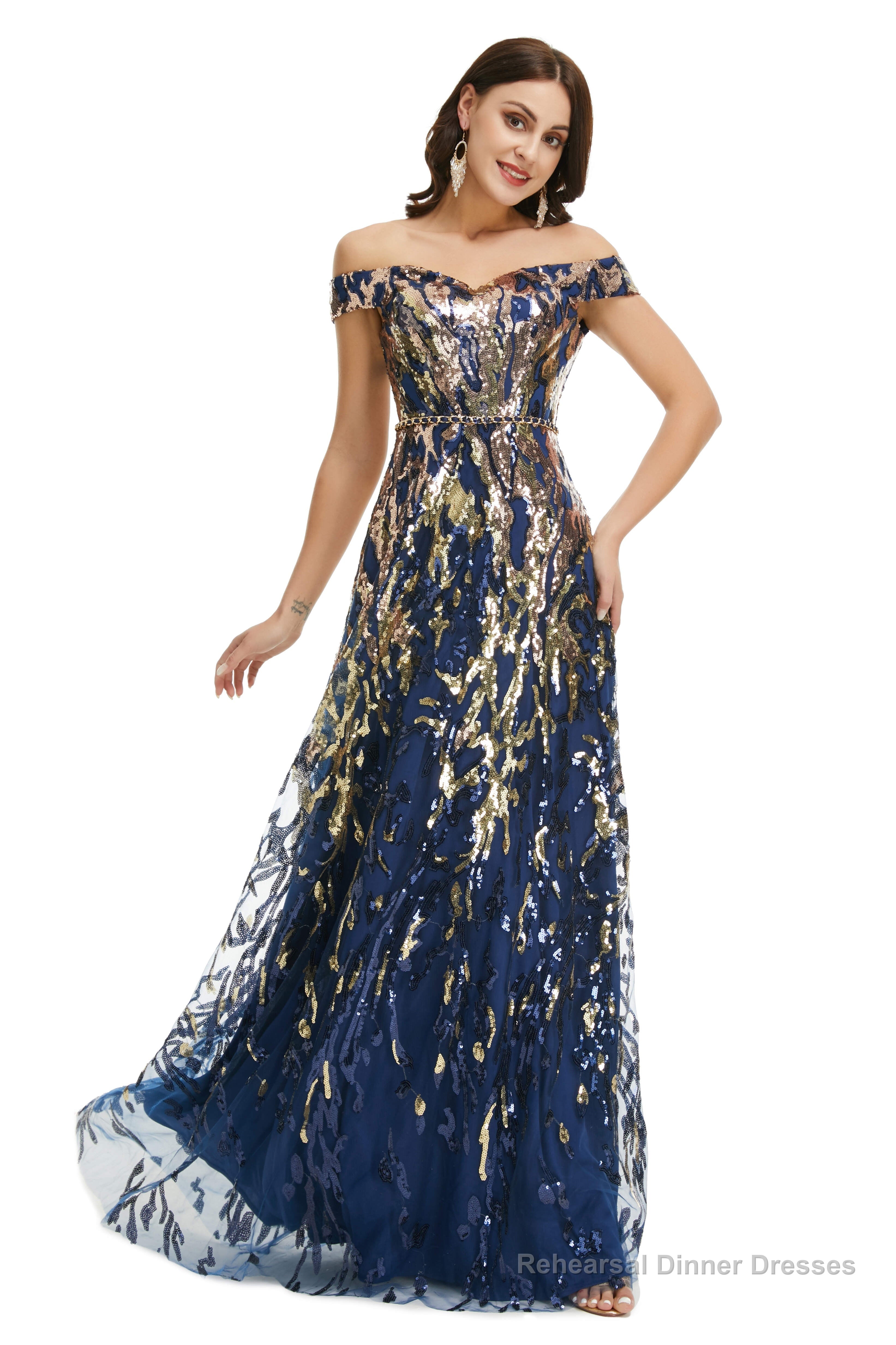 A Line Sequins Off the Shoulder Long Prom Dresses