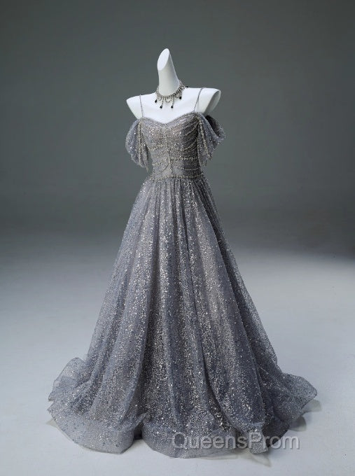 A-Line Spaghetti Strap Mesh Sequin Long Evening Prom Dress Graduation Evening Prom Adult Ceremony Dress