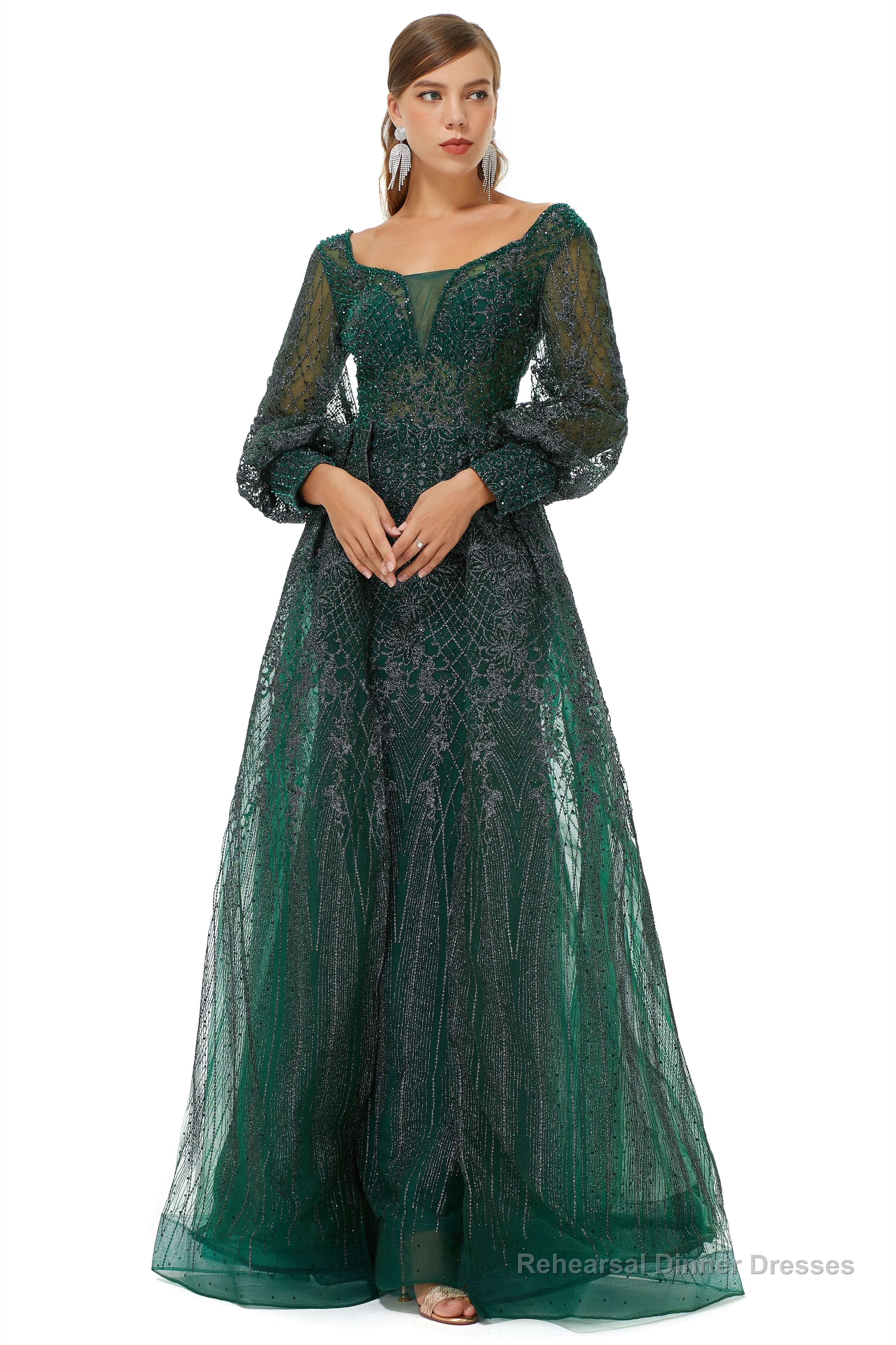 A-Line Square Neckline Sequined Floor-Length Long Sleeve Open Back Appliques Lace Prom Dresses
