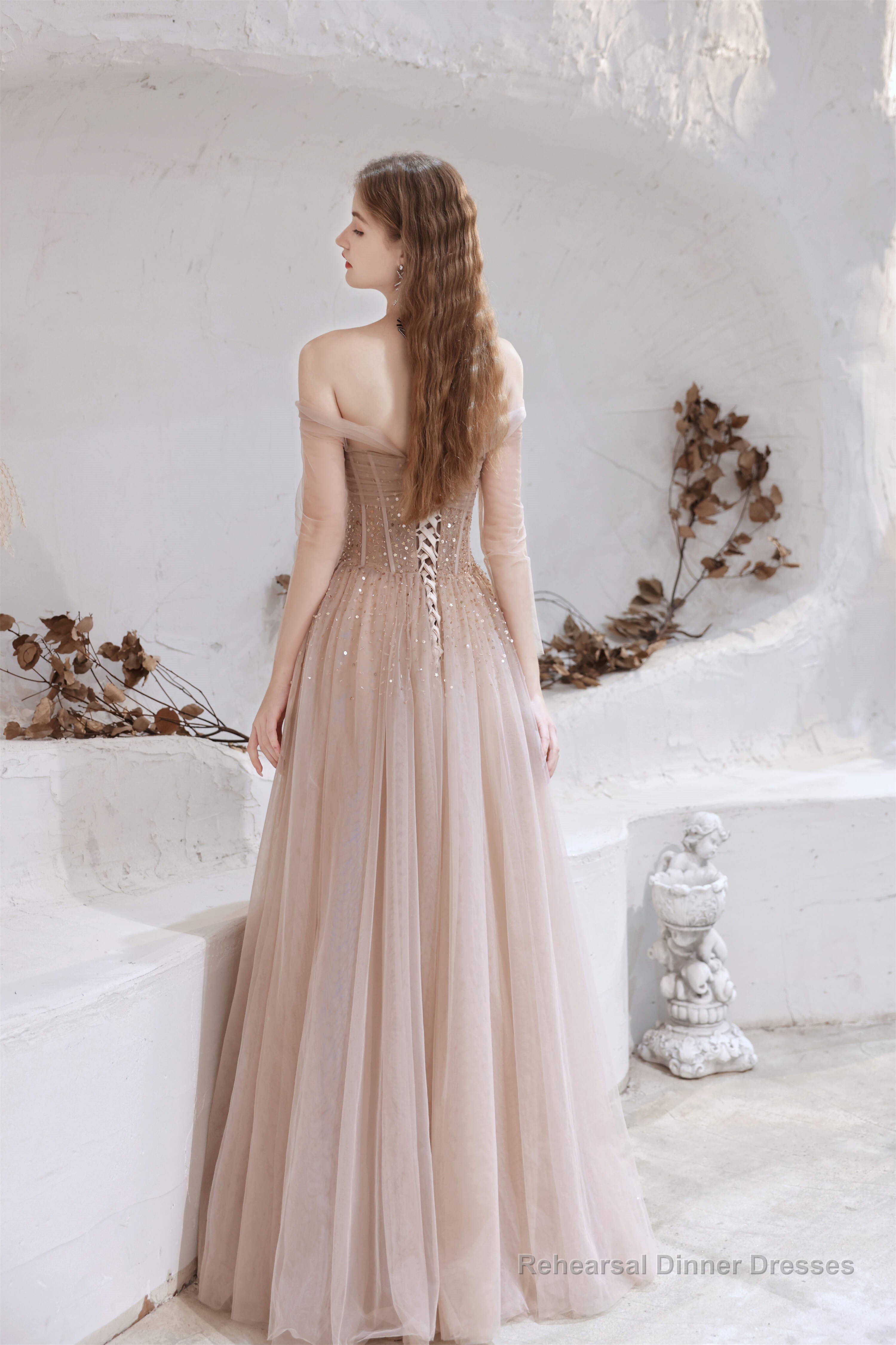 A-Line Strapless Off The Shoulder Lace Up Beading Tulle Long Prom Dresses