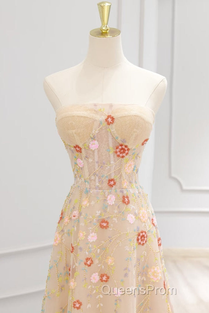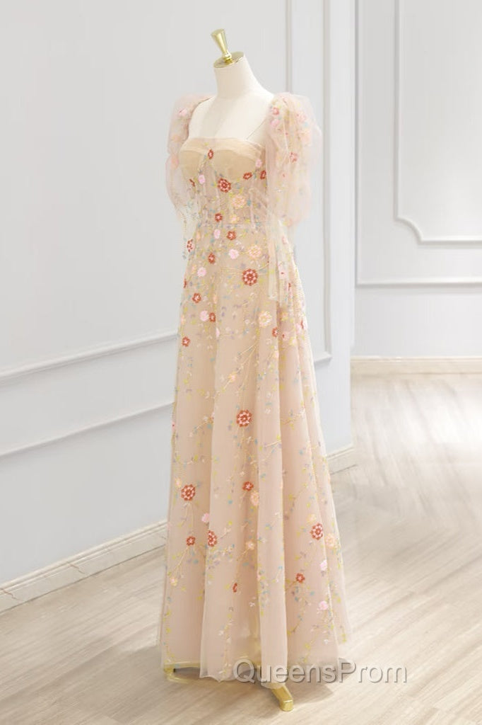 A-Line Tulle Lace Sequin Champagne Long Evening Prom Dress, Champagne Long Formal Dress