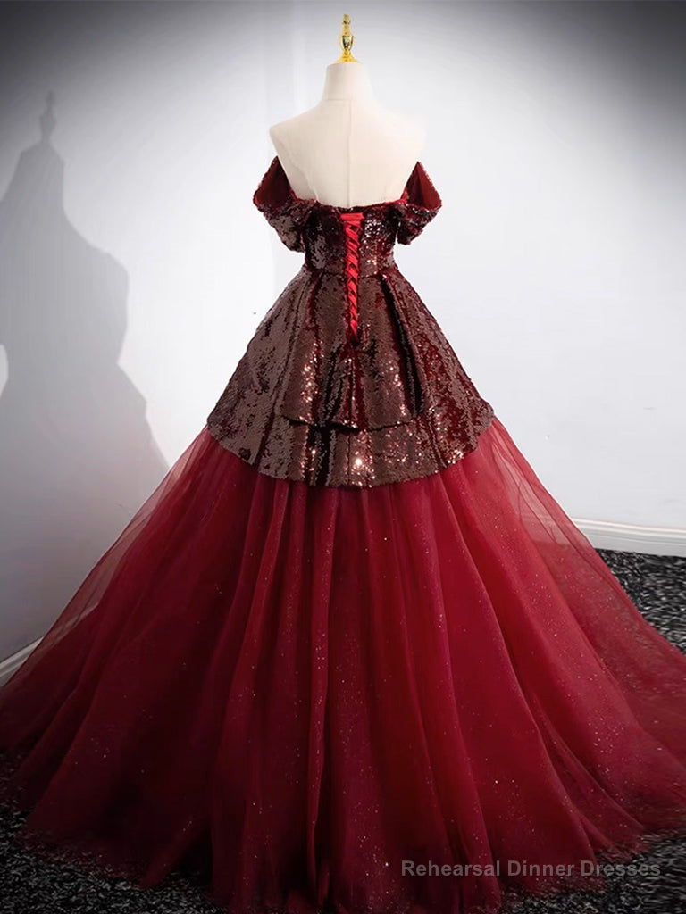 A-Line Tulle Sequin Burgundy Long Prom Dress, Off Shoulder Burgundy Formal Dress