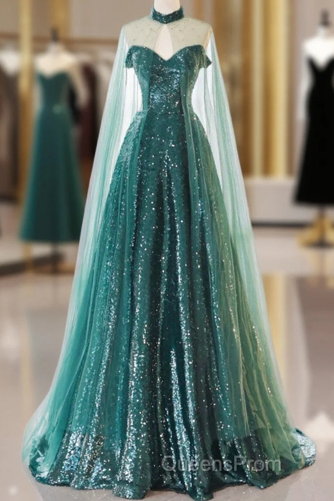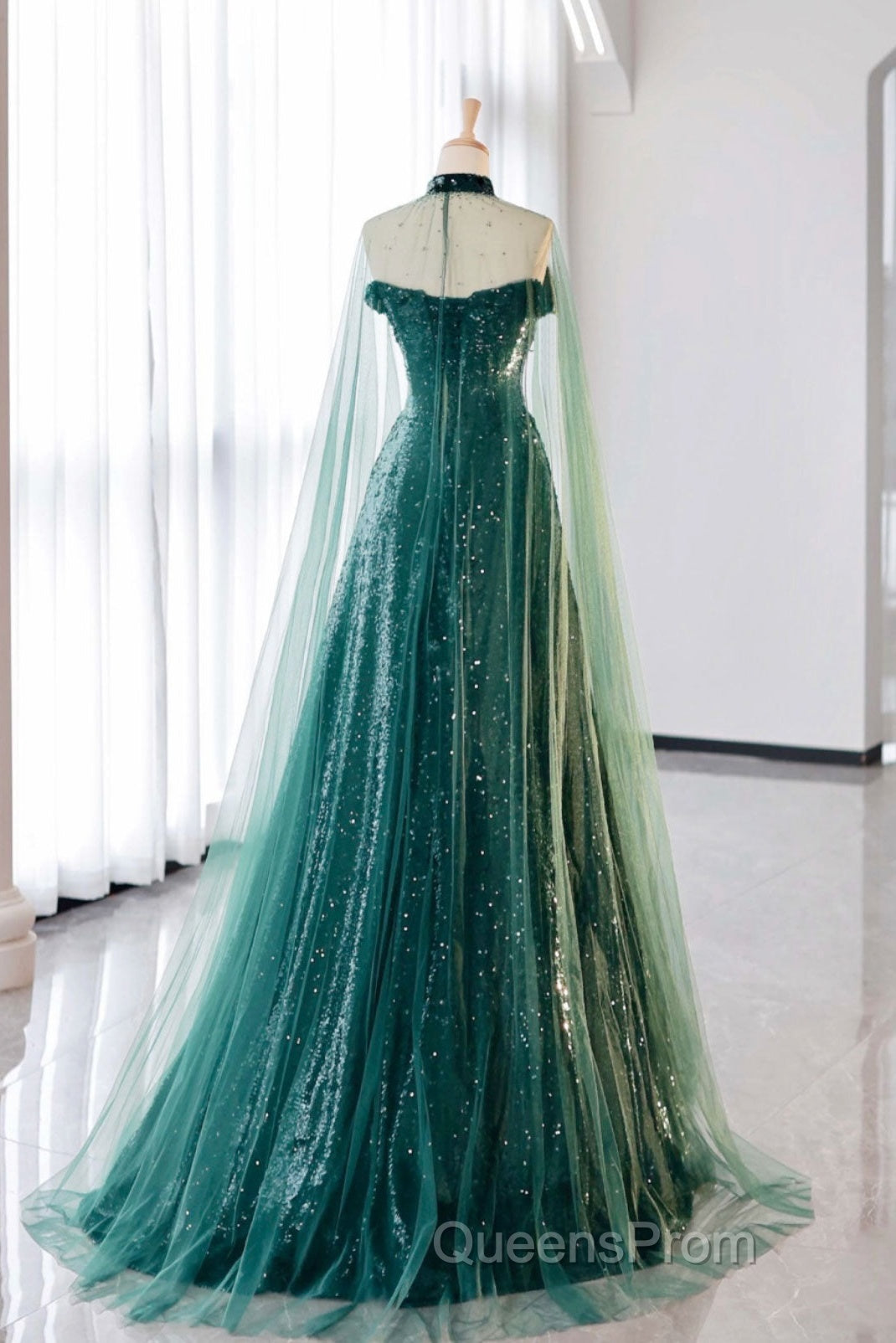 A-Line Tulle Sequin Green Long Evening Prom Dress, Green Formal Evening Dress
