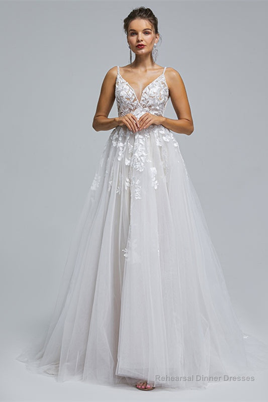 A-Line Tulle V-Neck Lace Beaded Flower Wedding Dresses