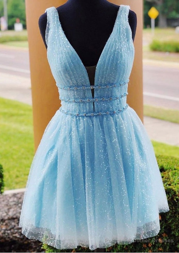 A-line V Neck Sleeveless Tulle Short/Mini Homecoming Dress With Beading Glitter