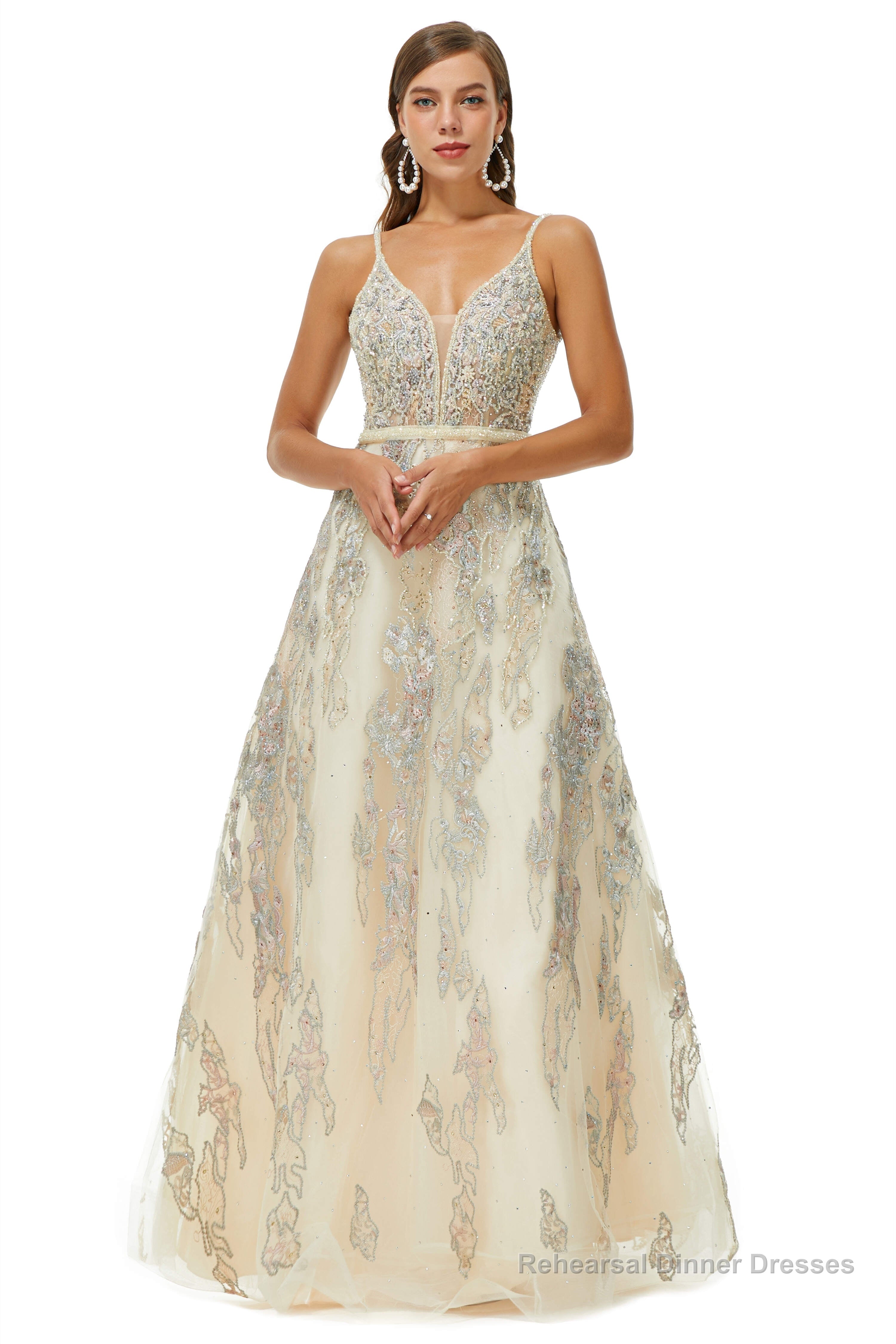 A-line V-neck Spaghetti strap Lace Floor-length Sleeveless Beading Prom Dresses