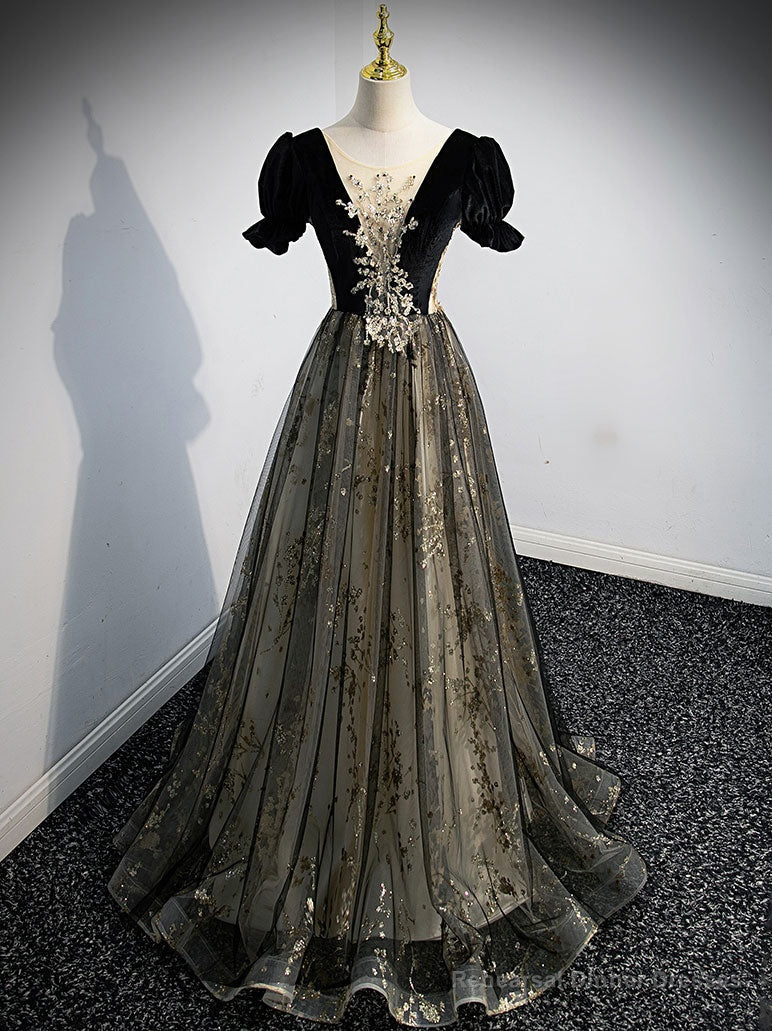 A line Velvet Tulle Lace Black Long Prom Dress, Black Formal Graduation Dresses