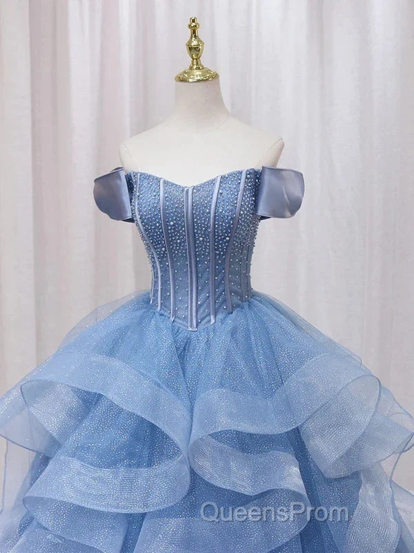 Adult Dress A-Line Blue Sheer Long Ball Dress Blue Sweet Dress Off Shoulder Evening Prom Dress