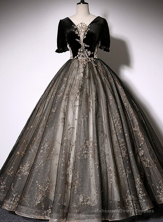 Beautiful Black Tulle Short Sleeves Long Party Dress Black Short Sleeves Prom Dress prom dresses shops