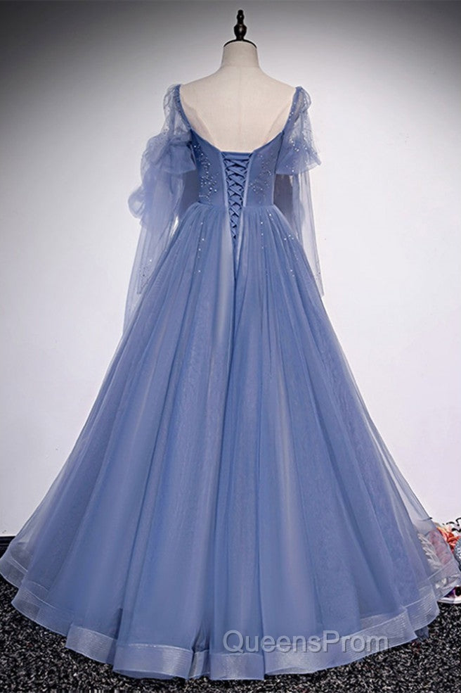Beautiful Blue Sheer Beaded Long Party Dress, A-Shaped Long Sleeved Backless And Floor Length Evening Dress