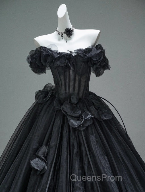 Black A-Line Off-The-Shoulder Tulle 3D Applique Long Evening Prom Dress,Adult Ceremony Graduation Evening Prom Dress