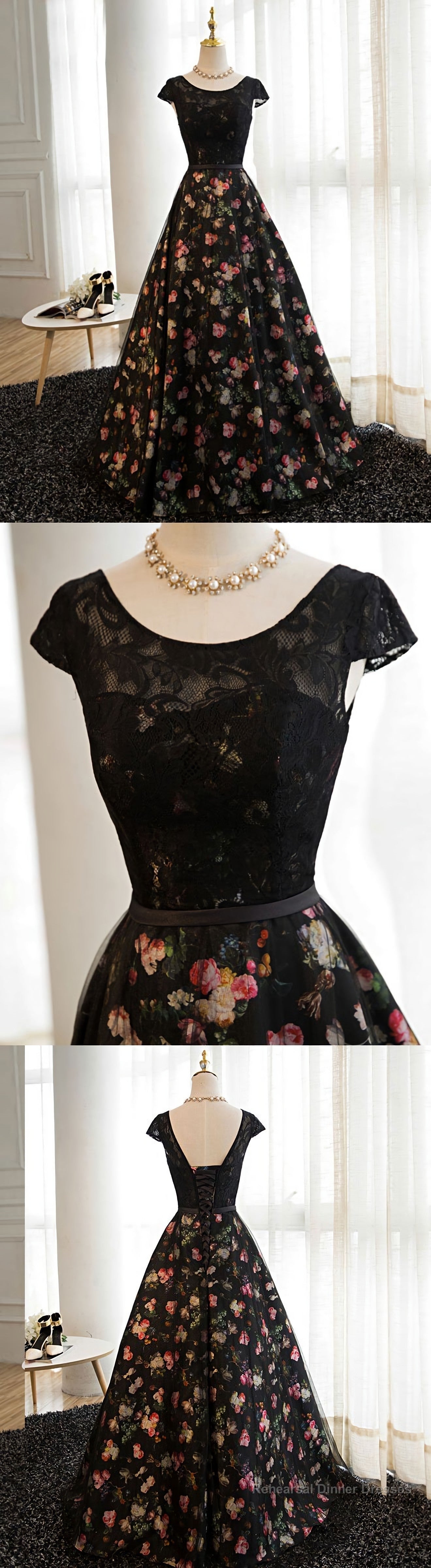 Black Lace Floral Patterns Long Prom Dress, Black Evening Dress