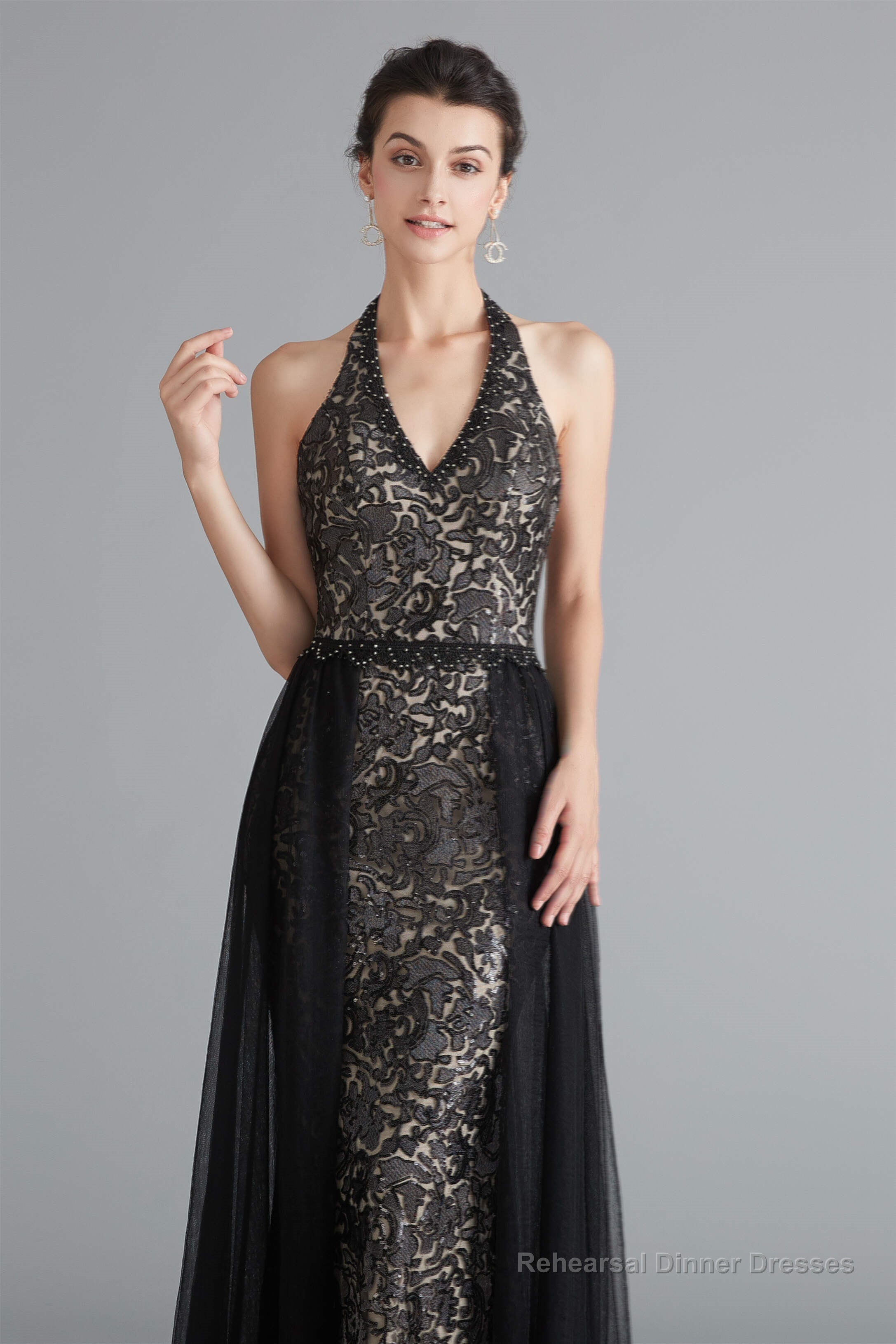 Black Lace Halter Prom Dresses with Tulle Overskirt