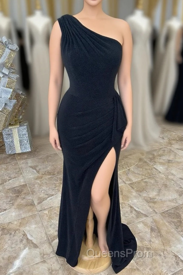 Black One Shoulder Mermaid Ruffle Long Mother of Bride Dress with Slit