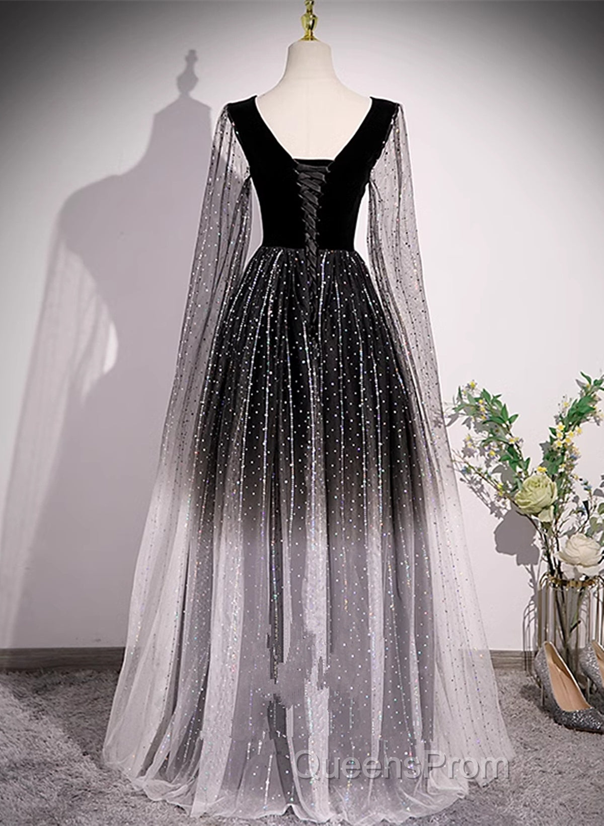 Black Shiny Tulle Gradient Tulle V-Neckline Party Dress, Black Tulle Evening Prom Dress