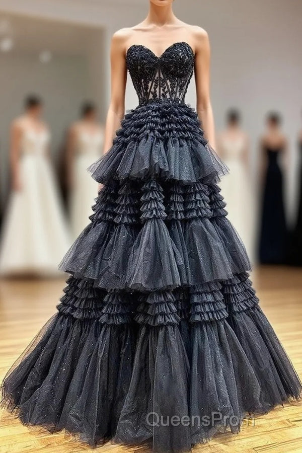 Black Sweetheart Neck Tulle Lace Long Evening Prom Dress, Black Formal Evening Dress