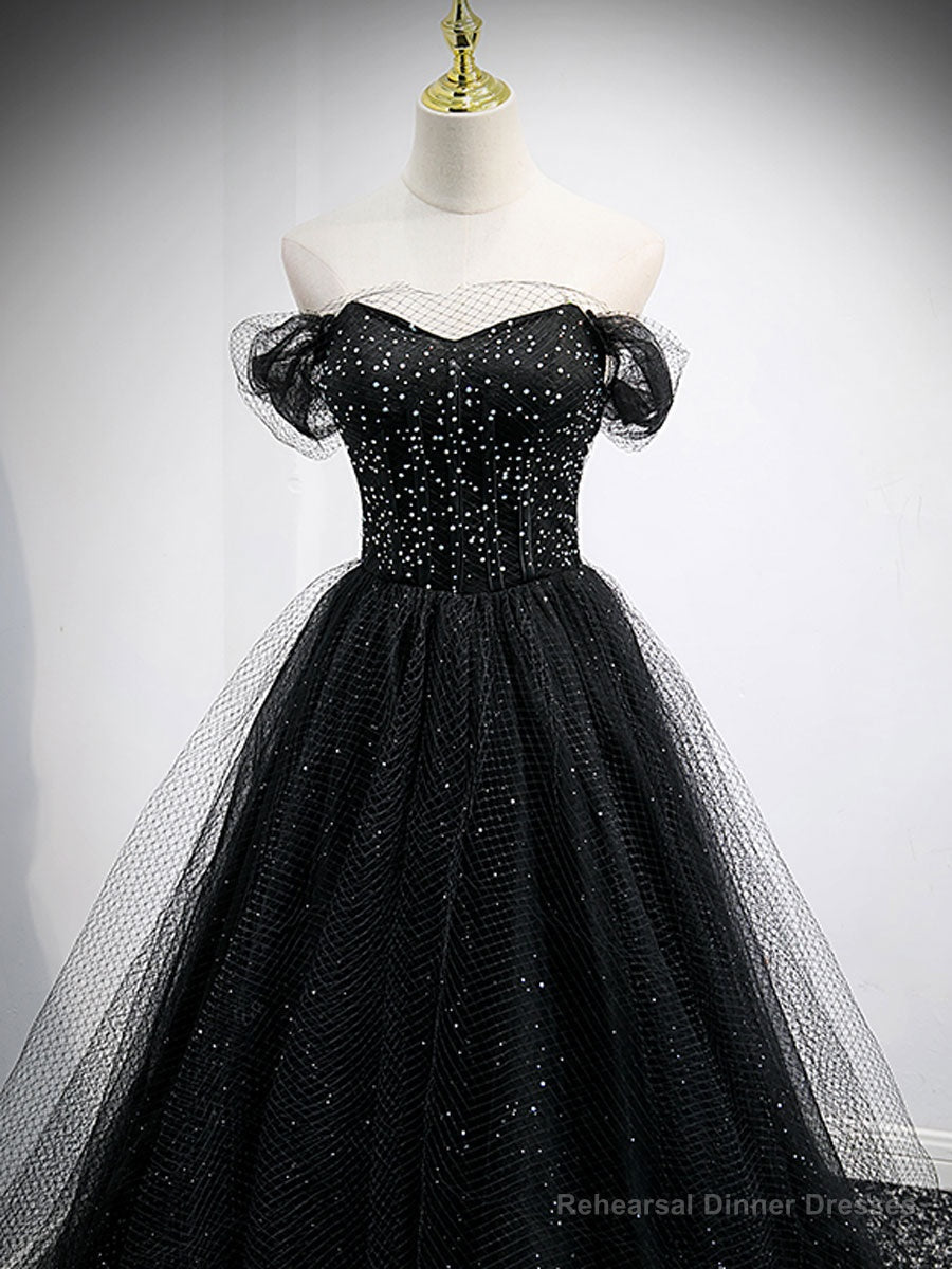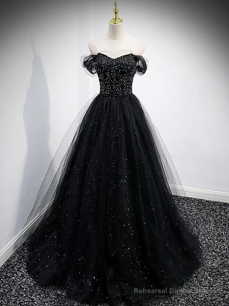 Black Sweetheart Off Shoulder Tulle Long Prom Dress, Black Evening Dress