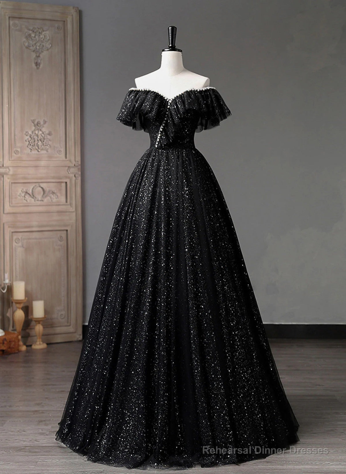 Black Tulle Beaded Long Formal Gown, Black Tulle A-line Prom Dress