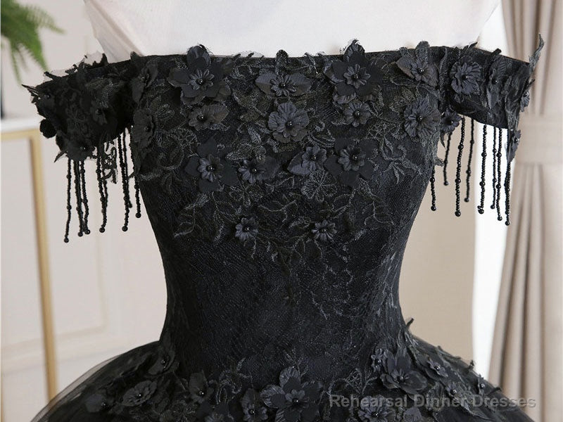 Black Tulle Off Shoulder Lace Long Prom Dress, Black Evening Dress