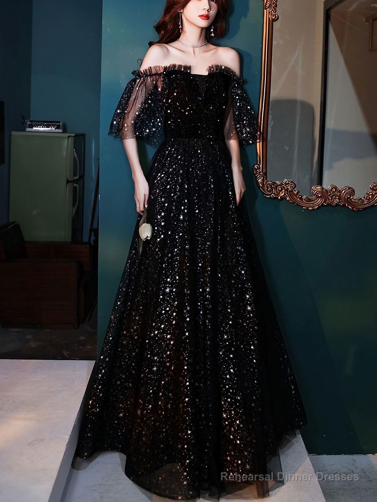 Black Tulle Off Shoulder Tulle Long Prom Dress, Black Evening Dress