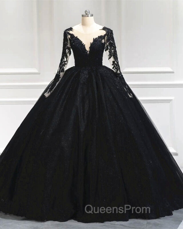 Black Tulle Sheer Neck Appliques Ball Gown Dress