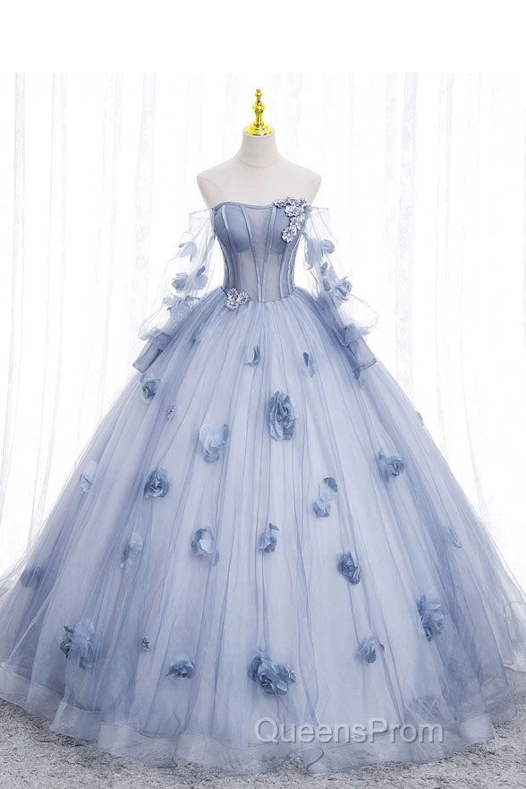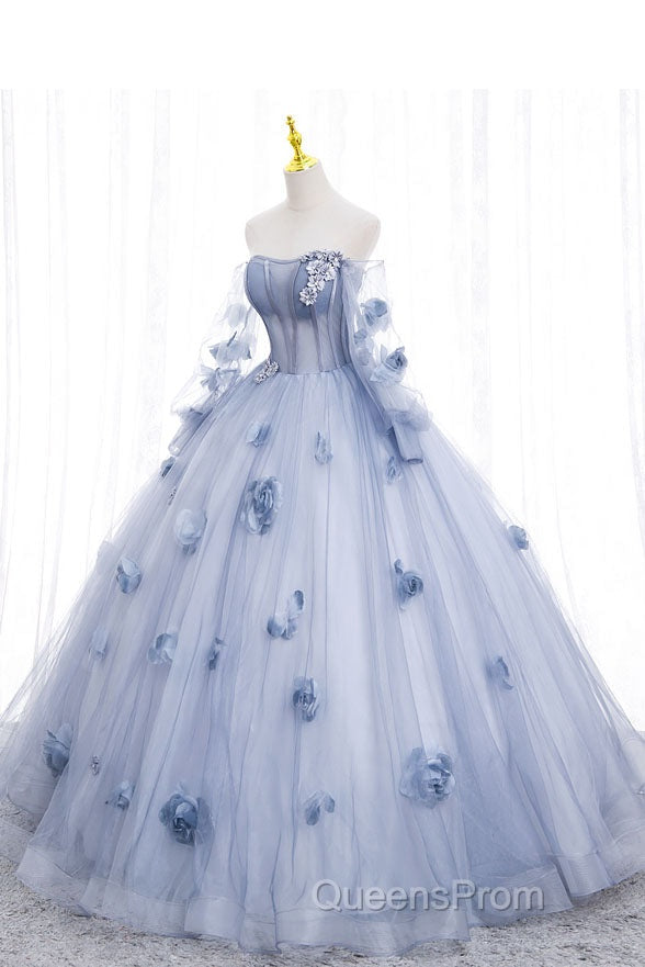Blue Long Sleeves Tulle Evening Prom Dress with Flowers, Puffy Off the Shoulder Quinceanera Dress