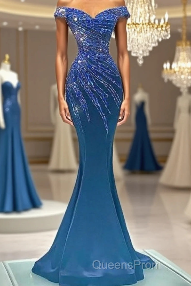 Blue Robe De Soiree Mermaid Off The Shoulder Beaded Crystals Long Evening Prom Dress Evening Prom Gown Evening Dress