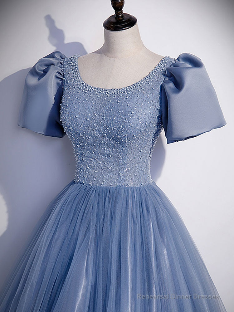 Blue Round Neck Tulle Sequin Beads Long Prom Dress, Blue Evening Dress