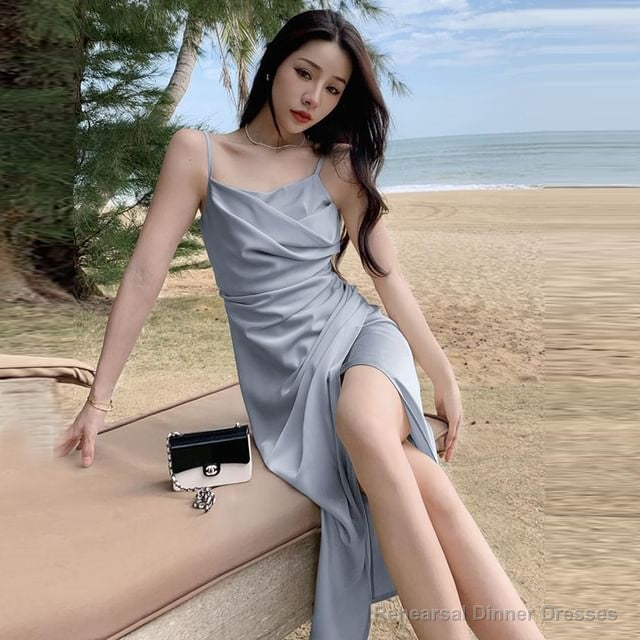 Blue Spaghetti Strap Cowl Neck Plain Ruched Satin Slit Midi Sheath Dress