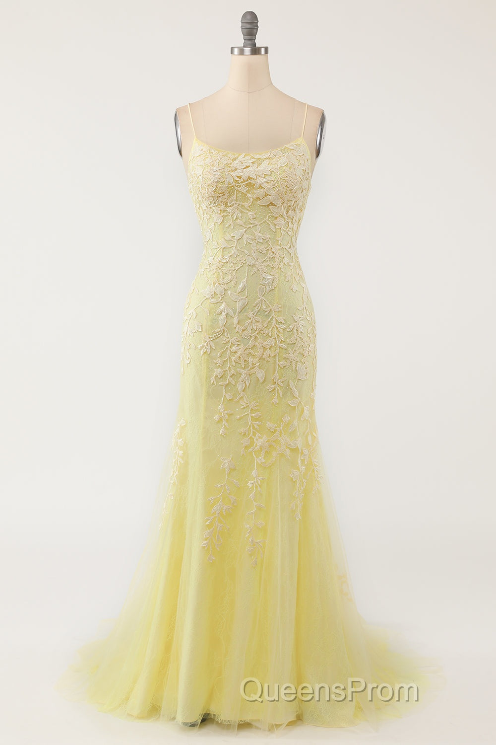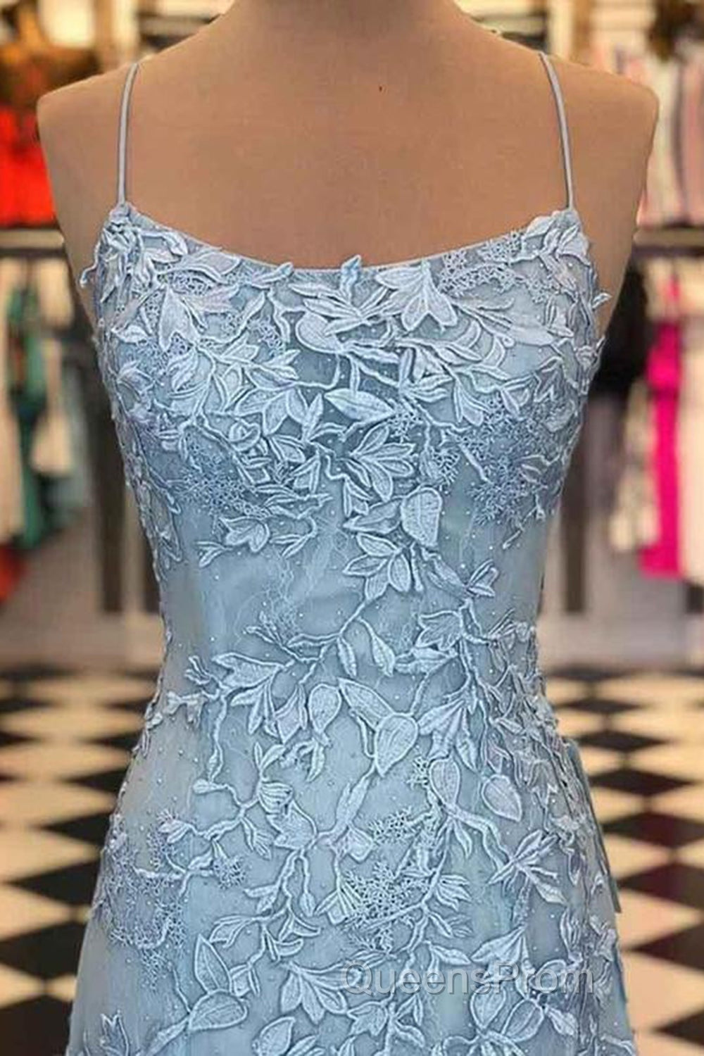 Blue Spaghetti Straps Backless Appliques Evening Prom Dress