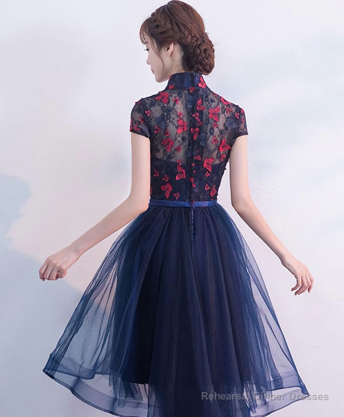 Blue Tulle Lace High Low Prom Dress, Blue Homecoming Dress